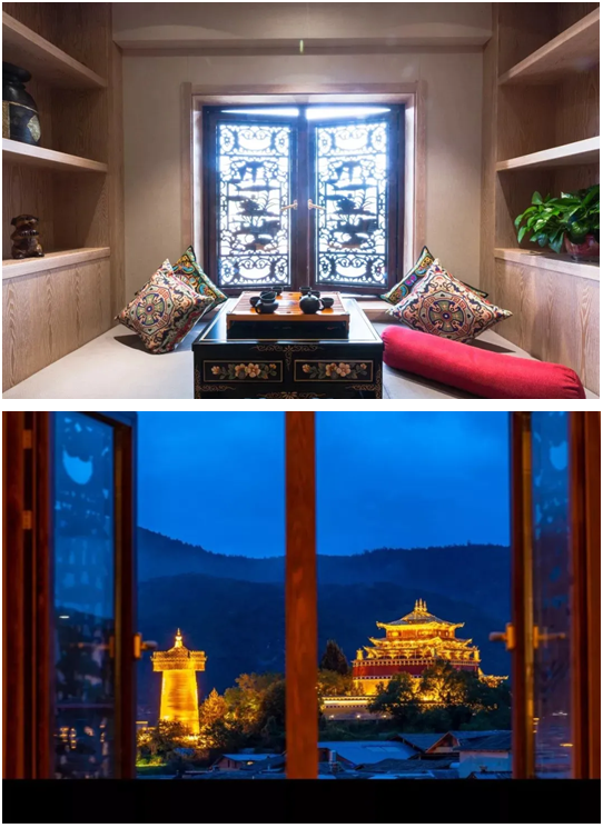 客房陽臺上還有一個(gè)藏式榻榻米,午后的閑暇時(shí)光可以百無聊賴地休息一會兒,透過精美木雕的縫隙,窗外直面古城標(biāo)志性的景觀。暖洋洋的日光照在身上,舒服得忍不住閉上了眼?! ?/p>