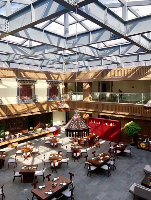 從客房到幸運(yùn)隕石餐廳,純正的藏式風(fēng)情充斥在酒店的角角落落。玻璃天窗讓吃飯的時(shí)候也能觀賞到無邊的風(fēng)景,高原暖洋洋的陽光和美食一樣令人心情愉悅。