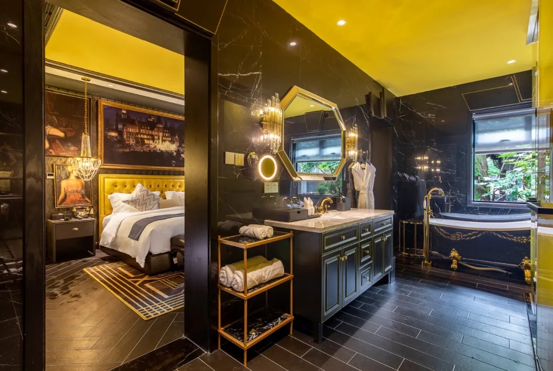 這就是杭州西湖殿影酒店,建筑由近百年的私人府邸改造而來。主題酒店設(shè)計師大膽地將現(xiàn)代電影情境重新演繹民國時期的故事,在微妙的化學(xué)作用下,賦予酒店新的靈魂。